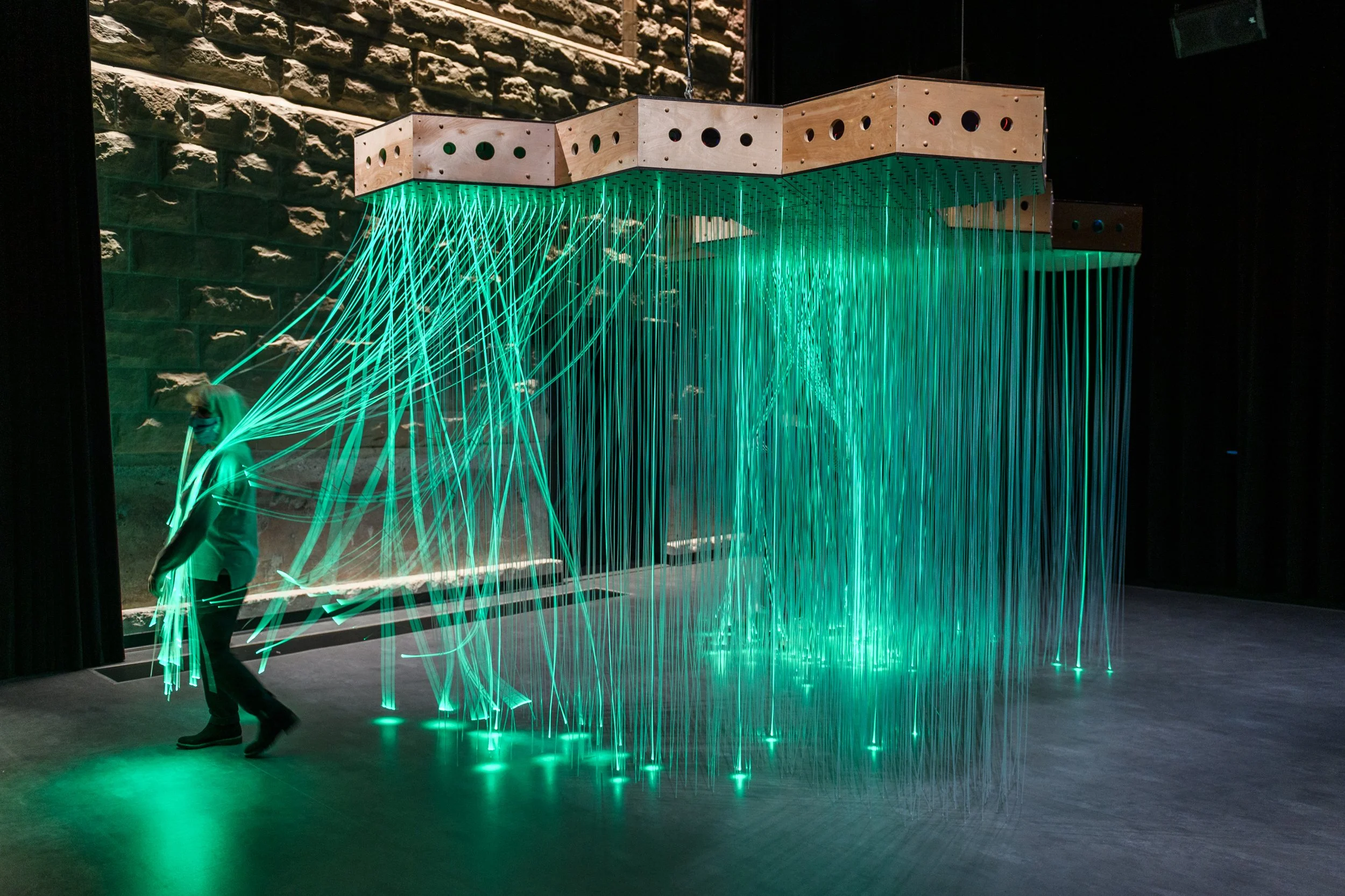 - A dense forest of fiber optic cables dangle from a canopy of wooden hexagons suspended ten feet in the air. Viewers/participants are invited to wander through the sculpture and immerse themselves in a warm aqua green light that is emitted from the strands as they move. Momentarily illuminating their path, the light flickers and fades in their wake. Each fiber optic strand is connected to a mechanical trigger that signals a tiny microcontroller to turn on its light emitter. The tessellation of hexagons above can be reconfigured to respond to the space the piece occupies.